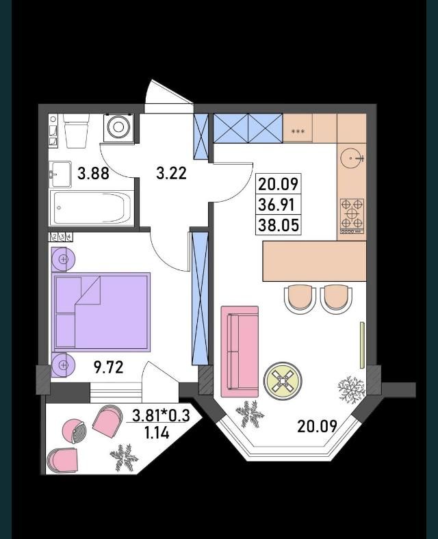 Площадь общая: 39 м²