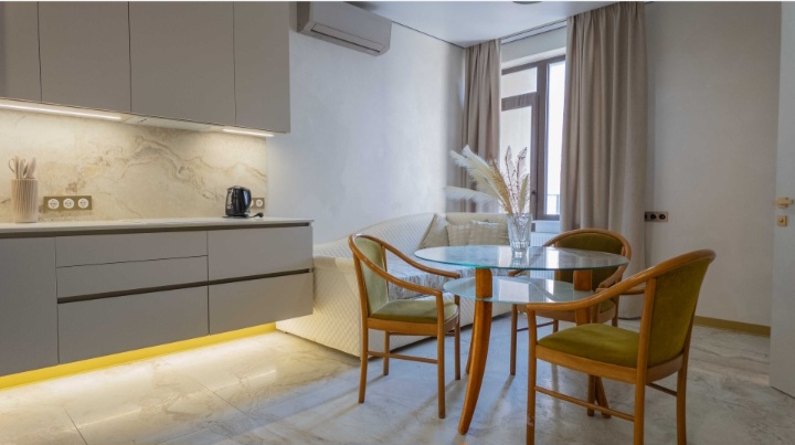 В продаже однокомнатная квартира в Центре Аркадии. Квартира полностью укомплектована дорогой, брендовой мебелью, бытовой техникой, сантехникой, и электроникой (бесконтактные розетки и т. п.). Много зон теплых полов, качественная шумоизоляция, создает уют и комфорт для Вас и Вашей семьи. Прекрасный вид с балкона на Генуэзскую улицу. Закрытая, охраняемая территория, паркинги, обеспечивает безопасность для всех жильцов комплекса. Развитая инфраструктура и транспортная развязка. Рядом море.