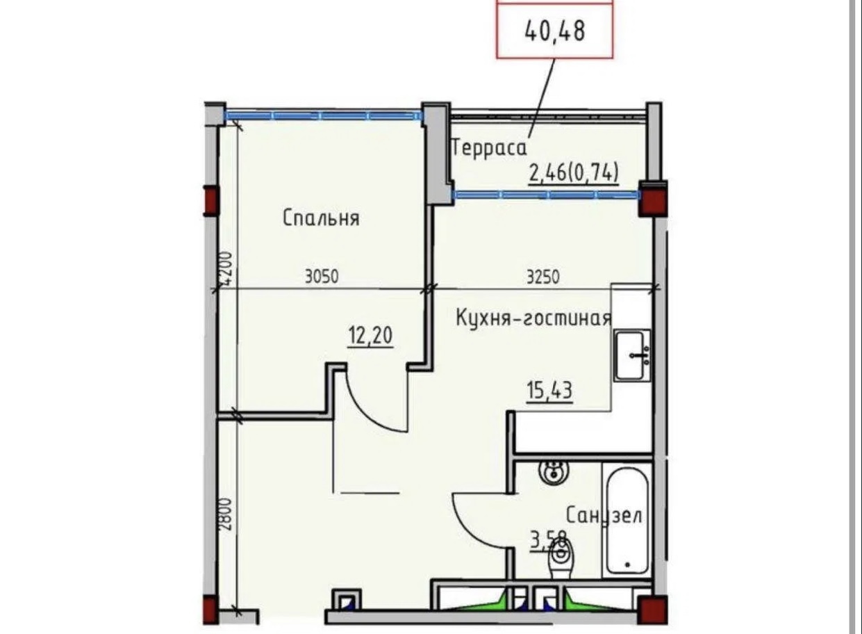 Площа загальна: 40.48 м²