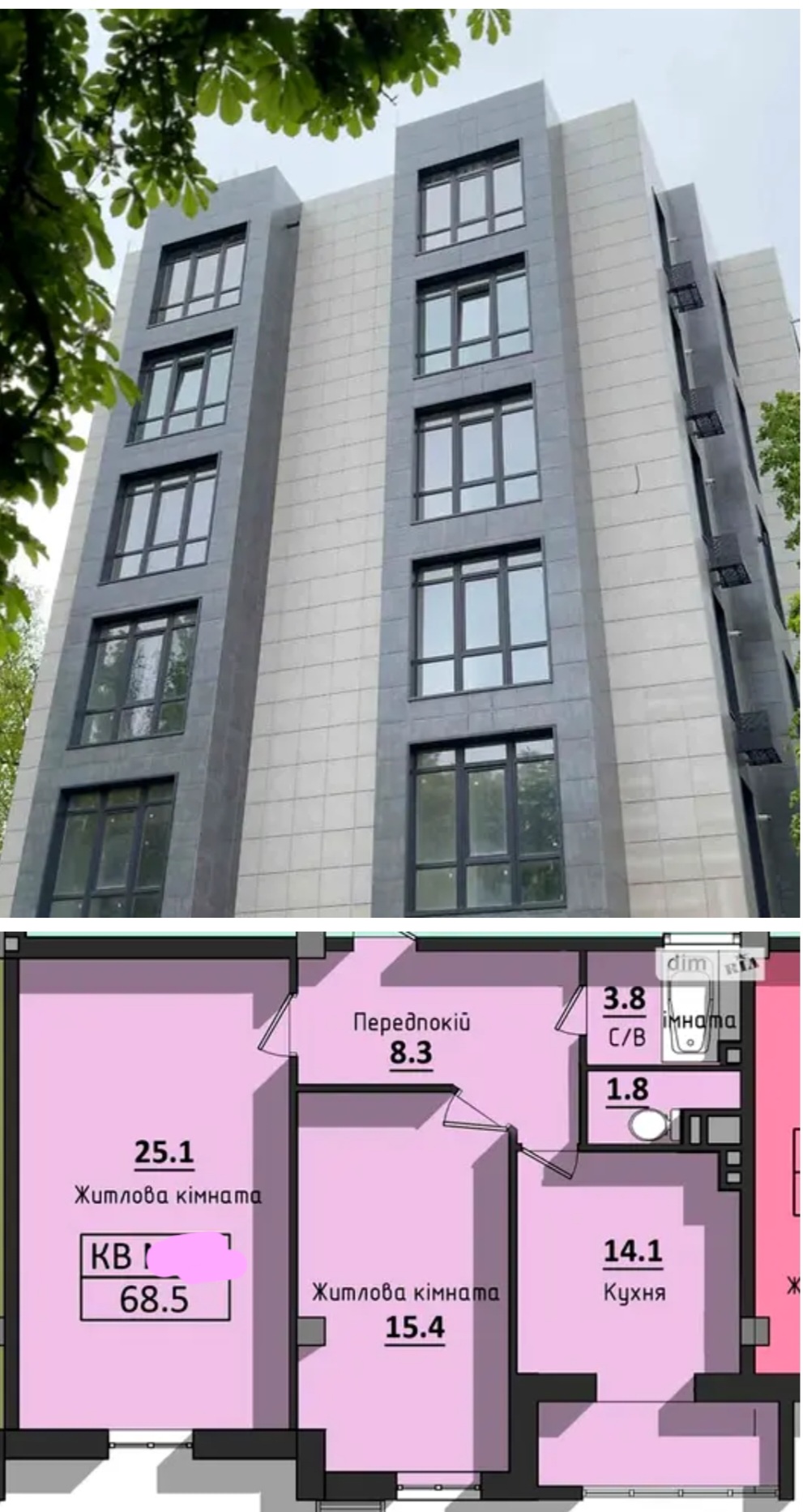 Площадь общая: 68.5 м²