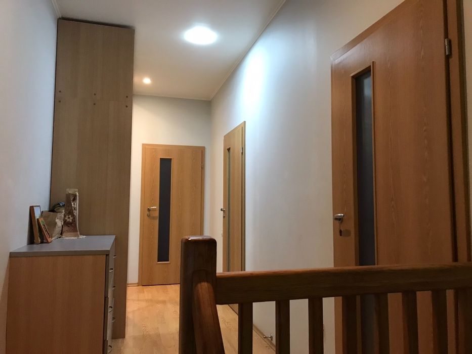 Перший поверх - кухня з вітальнею, передпокій, санвузол. Другий поверх - три окремі кімнати: кабінет, дитяча, хазяйська спальня з ванною .В квартирі зроблений якісний ремонт, залишаються всі меблі і побутова техніка